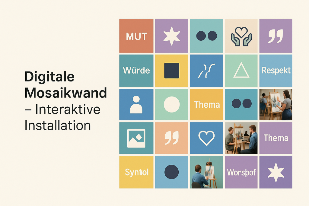 Durch Interaktion verändert sich das Mosaik. Es lebt, wächst und reagiert aus den Eingaben. Digitale Form für Vielfalt.