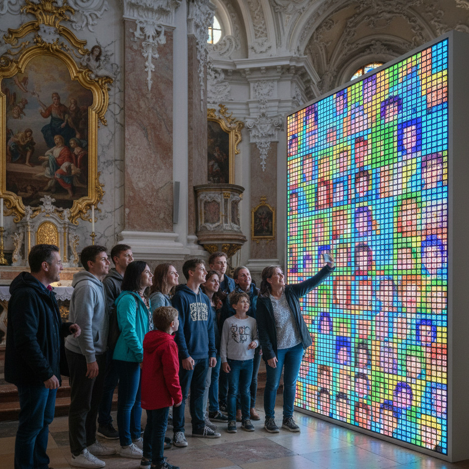 Idee: Verpixelte Fotos aus Gemeindeprojekten als dynamisches Mosaik auf Kirchenwand projizieren