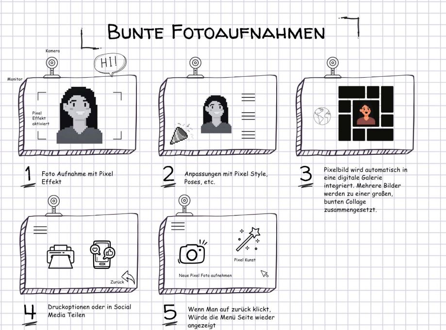 Animation: Pixel zerstreuen → zusammenformen → Fotos zeigen Upload: Fotos per USB/Stick einfügen Fotos sollen dann vom Server gezogen werden