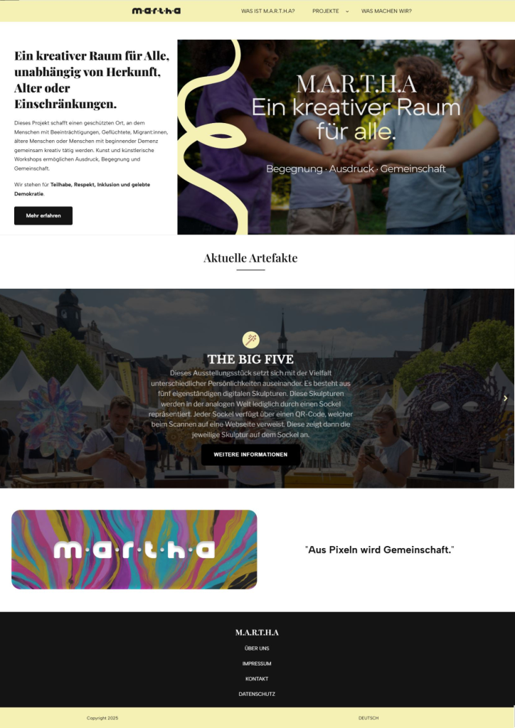 dieses interdisziplinäre Kunstprojekt digital aufzubereiten und eine zentrale webbasierte Kommunikationsplattform zu entwickeln. Ziel war die Konzeption und Umsetzung einer strukturierten, nachhaltigen und erweiterbaren Website, die sowohl Informationsmedium als auch Repräsentationsfläche des Projekts ist.